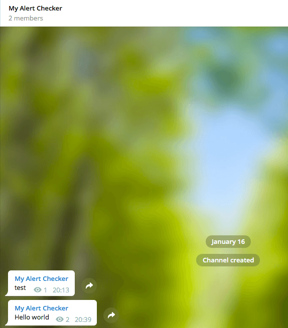 1 2 {"ok" :true ,"result" :{"message_id" :5,"chat" :{"id" :-1001348922431,"title" :"My Alert Checker" ,"type" :"channel" },"date" :1516124394,"text" :"Hello world" }}