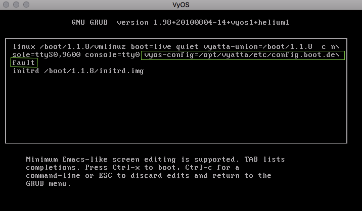 no-vyos-configure - Не загружать конфигурационный файл, только Linux-систему.no-vyos-migrate - Не выполнять миграцию конфигурации.no-vyos-firewall - Не производить инициализацию брандмауэра.no-vyos-rl-system - Отключается возможность загрузки системы в чистом виде перед загрузкой конфигурации.