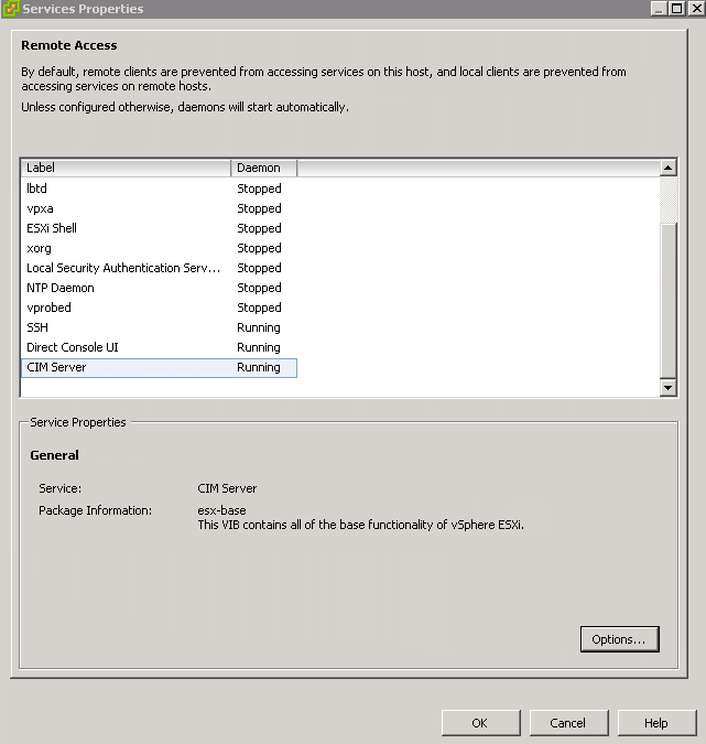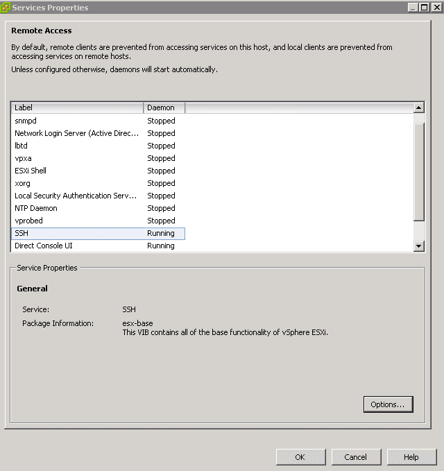 Для обновления драйвера потребуется включить SSH доступ на ESXi хосте. В vSphere клиенте перейдем во вкладку Configuration -> Security Profile, далее Properties для служб. Выбираем SSH, затем Options и запускаем службу SSH.